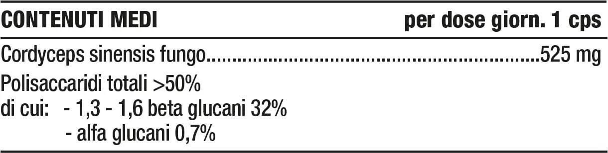 | Cordyceps sinensis Full Spec. tit. 39% polisaccaridi di cui: | 525 mg |
